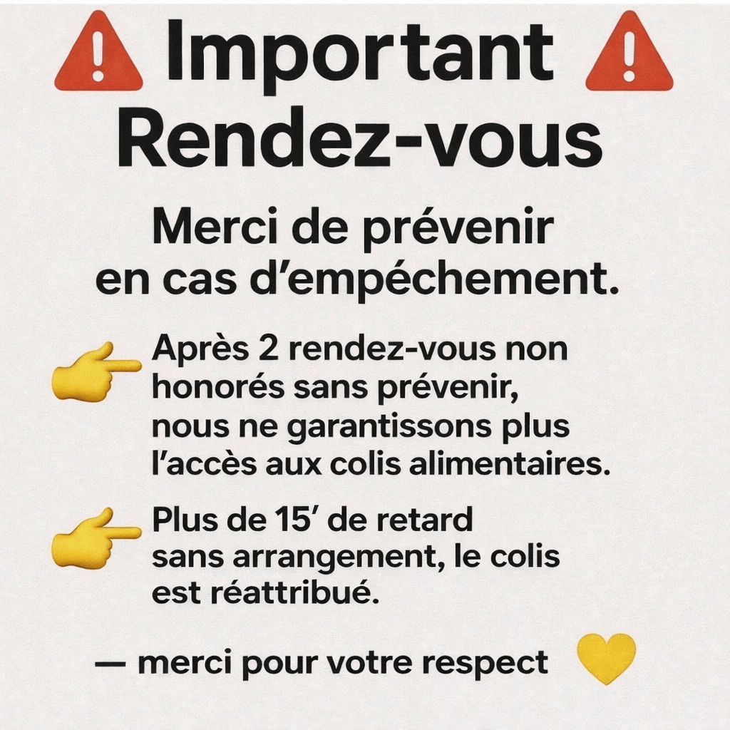 Après deux rendez-vous non honorés sans avoir prévenu, le collectif se réserve le droit de ne plus garantir l’accès aux colis alimentaires pour les rendez-vous suivants.